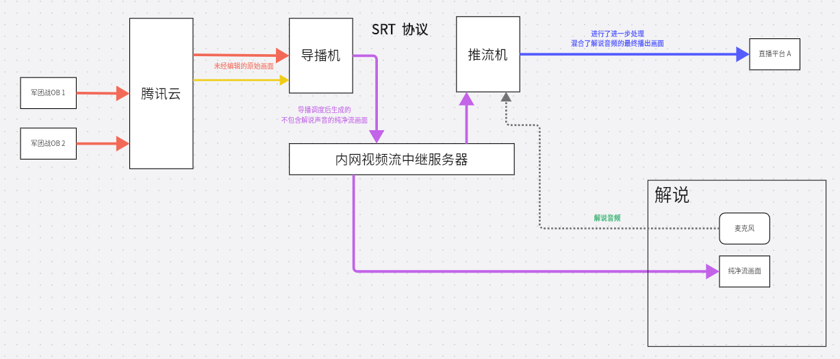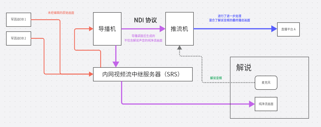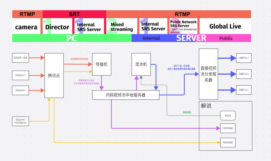 - 导播机上的 OBS 从 内网的 SRS 服务器拉取画面,并进行适当的调度编辑后,将解说和观众应该看到的画面推送到内网 SRS 服务器。