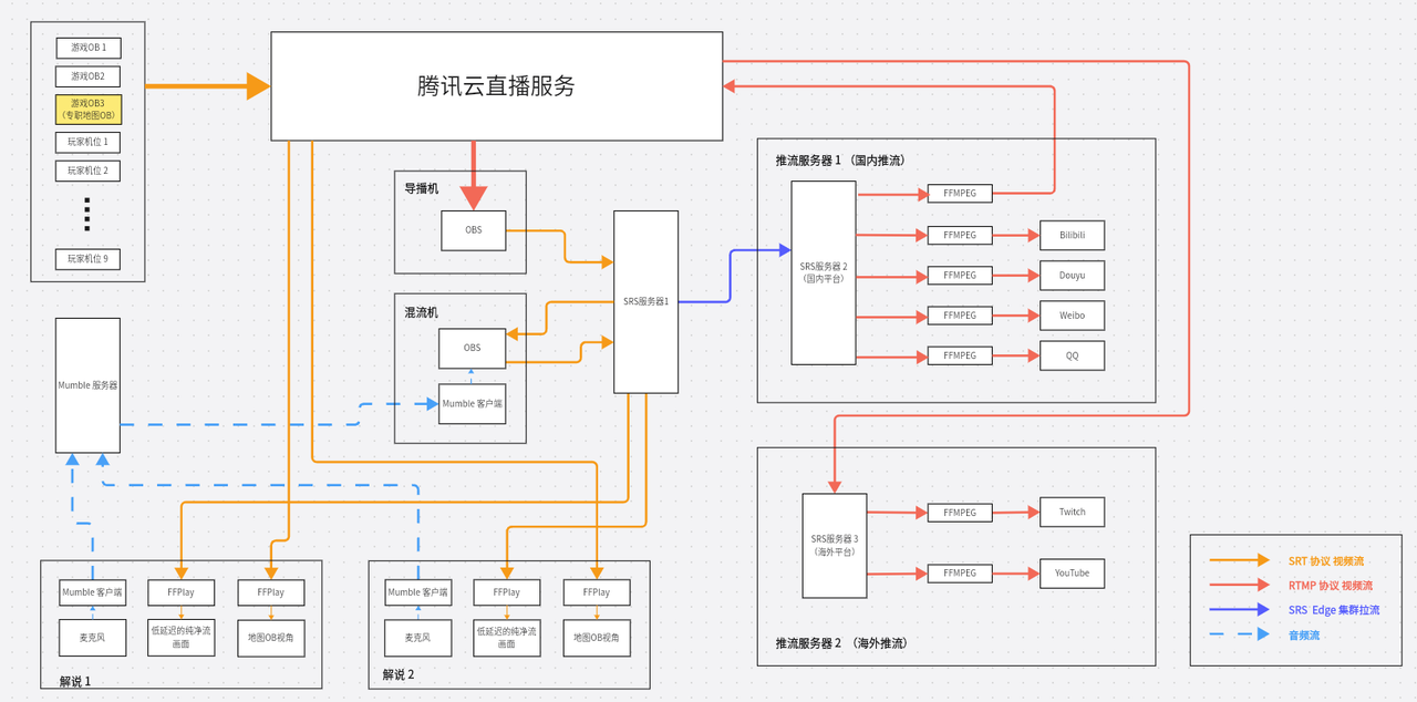 - 两个 OB 账户的操作者 使用 OBS 采集游戏画面,直接推送到导播所在的内网 SRS 服务器。